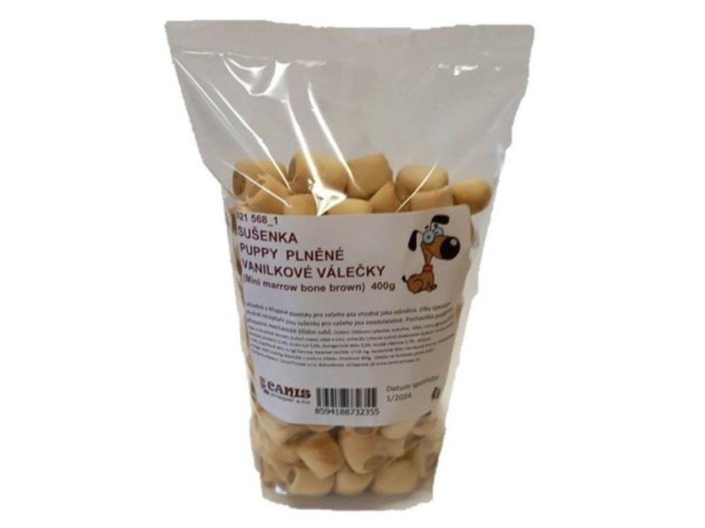 Doplňkové krmivo pro štěňata a psy malých plemen. Lahodné a křupavé pamlsky pro vašeho psa vhodné jako odměna. Pochoutka podporuje přirozené mechanické čištění zubů.Složení: obiloviny (pšenice, kukuřice, rýže), cukry (glukóza sirup), maso a živočišné deriváty (kuřecí maso), oleje a tuky, minerály (chlorid sodný).Analytické složení: hrubý protein (dusíkatý protein) 12,0%, hrubý tuk 5,0%, anorganické látky 3,0%, hrubá vláknina 1,7%, vlhkost 11.0%.Doplňkové látky (v kg) barviva: karamel 2a150a: 1716 mg, Senzorické látky: vanilkové aroma, Metabolická energie: 3361 kcal/kg.Dbejte na dostatek pitné vody!Doplňkové parametry