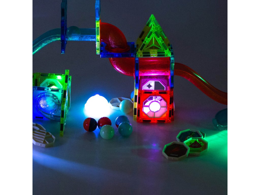 Sada obsahuje koule, které se při uvedení do pohybu rozsvítí, a reflektory, které vytvořené konstrukce osvětlí. To vše zaručí, že stavba bude v noci vypadat krásně.