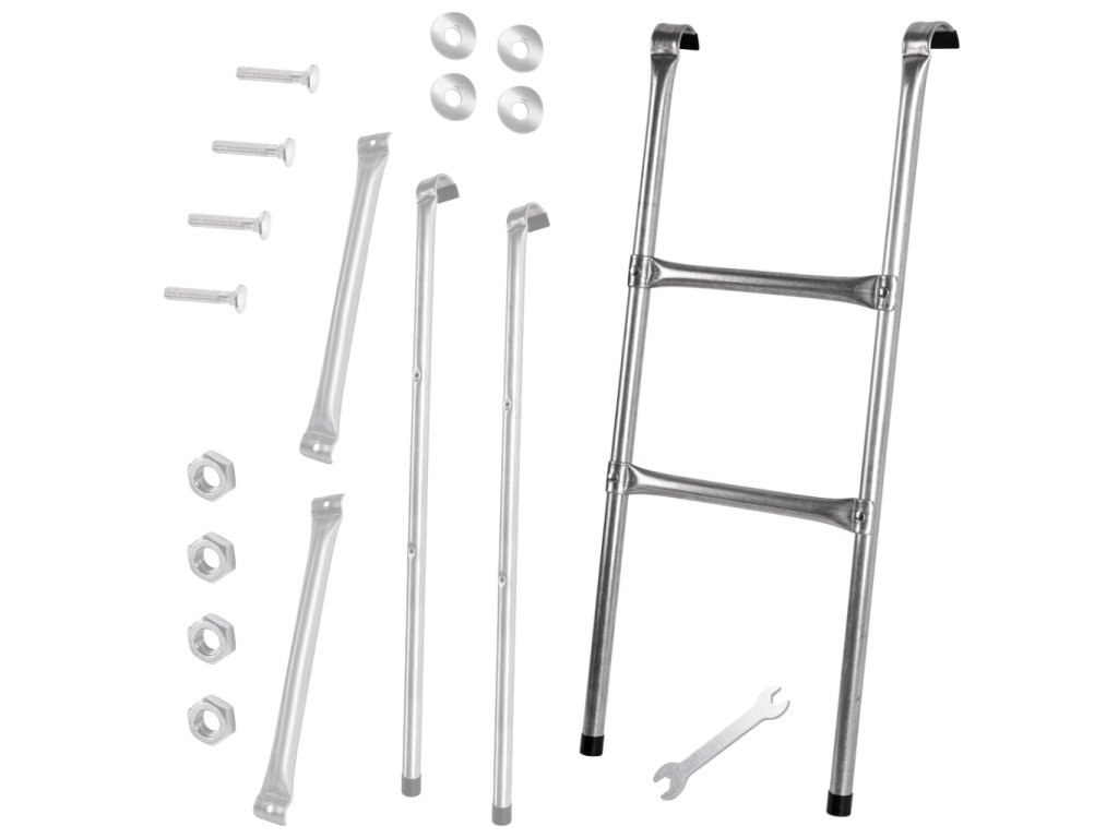 Vhodné Žebřík jenezbytným doplňkem každé trampolíny - usnadňuje výstup na pružnou podložku. Mádva 30 cm široké stupně. Je zakončen háčky, kterými by měl být připevněn k rámu trampolíny.
