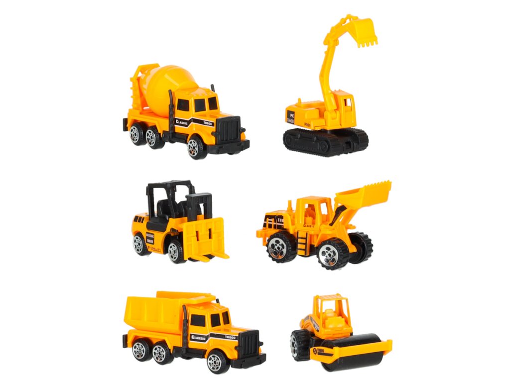 Sada obsahuje 6 žlutých kovových stavebních strojů:
