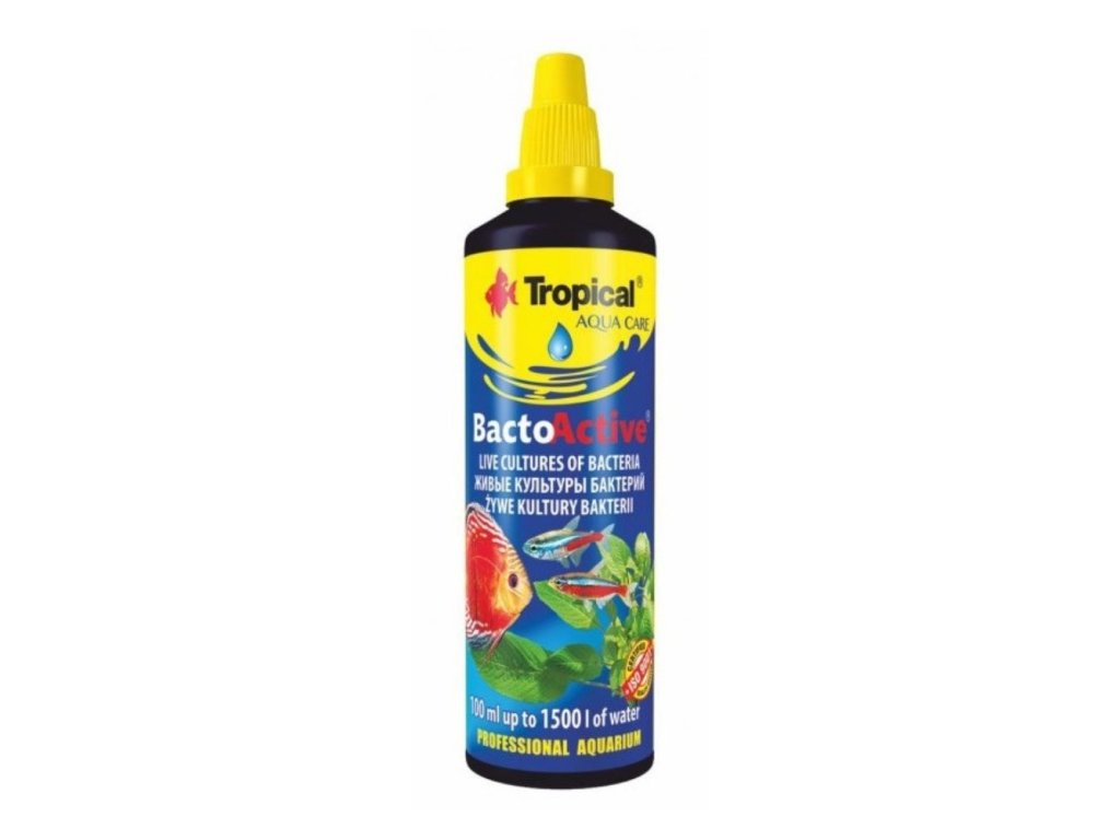 Je určen pro použití v nových nádržích s upravenou vodou a dále ve stabilizovaných akváriích po výměně vody, filtru nebo po léčbě ryb. Přípravek efektivně urychluje proces dozrávání akvária a stimuluje rozvoj nitrifikačních bakterií. Při pravidelném používání zaručuje v nádrži biologickou rovnováhu.Způsob použití: Vodu z vodovodu upravit přípravkem Antychlor nebo Esklarin. Před použitím protřepat! Čerstvě založená akvária – 5 ml / 75 l vody jednou týdně, po 3 týdnech dávkovat jako v zaběhnutých akváriích. Zaběhlá akvária – 5 ml / 45 l vody jednou měsíčně. Slaná voda zpomaluje účinek TROPICAL BACTO-ACTIVE a proto je nutné použít o 25–50% přípravku více.Doplňkové parametry