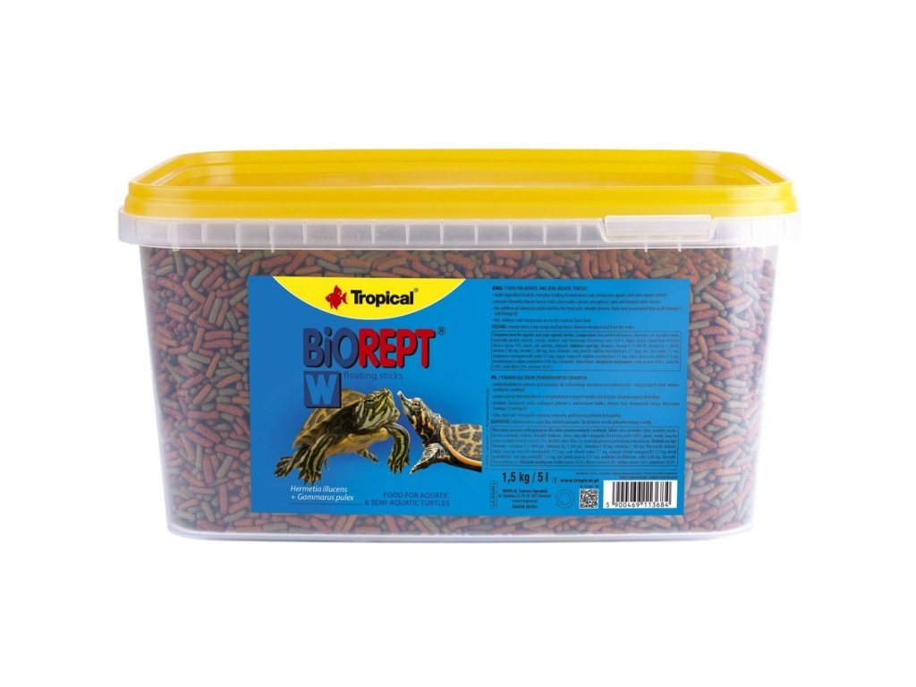 Speciálně zvolená výživných složek zajišťuje požadavky želv na výživu. Výborná chuť tyčinek způsobuje, že je zvířata mají velmi rády. Vhodně zvolena kombinace vitamínů a mikročástic zaručuje správný vývoj kosti a krunýře želv, chrání proti deformacím a dalším závažným zdravotním problémům. Želvy, které se pravidelně krmí tyčinkami Biorept W se rovnoměrně vyvíjejí a mají výbornou kondici. Pro vodní a bahenní želvy doporučujeme také další krmiva značky Tropical – Reptotabin a Gammarus.Složení: ryby a rybí výrobky, výrobky rostlinného původu, rostlinné bílkovinné výtažky, měkkýši a korýši (mj. Gammarus pulex 4,8%), obilí, řasy, droždí, oleje a tuky, krmné směsi minerálního původu (včetně zeolitu 1%)Doplňkové látky v kg: vitamín A 21.000m.j., vitamín D3 1.260m.j., vitamín E 80mg, vitamín C 300mg; železo 27,5mg, zinek 7,7mg, mangan 5,7mg, měď 1,4mg, jód 0,17mg, selen 0,17mg, molybden 0,04mg; barviva, antioxidantyAnalytické složky: hrubý protein 40%, hrubé oleje a tuky 6%, hrubá vláknina 3%, vlhkost 10%Doplňkové parametry