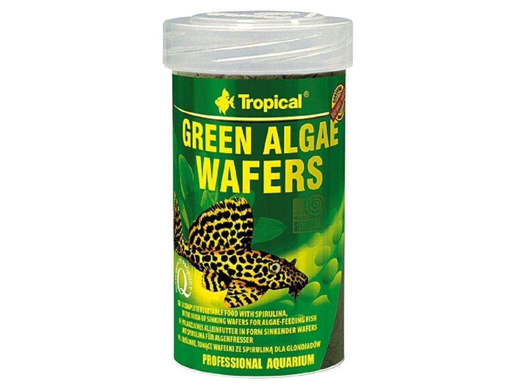 Kromě toho oplatky výborně doplňují stravu všežravých druhů ryb přijímajících potravu u dna a sladkovodních i mořských korýšů. Green Algae Wafers je krmivo s velmi velkou hydrostabilitou (při nasakování vodou, udržuje svojí strukturu a nerozpadává se), což usnadňuje krmení korýšů, a umožňuje rybám, jejichž tlama má podobu přísavky se zuby, kterými ryba škrábe potravu z tvrdých ploch, způsob přijímání potravy blízky přirozenému. Složení: vedlejší produkty rostlinného původu (v tom Terminalia catappa min. 2%), bílkovinné extrakty rostlinného původu, řasy (v tom Ascophyllum nodosum min. 4%, Spirulina platensis min. 3%), ryby a výrobky z ryb, měkkýši a korýši, obiloviny, kvasnice, oleje a tuky, minerální látky (v tom zeolit 1%).Analytické složky: hrubý protein 45,0%, hrubé oleje a tuky 6,0%, hrubá vláknina 5,0%, vlhkost 10,0%.Doplňkové parametry
