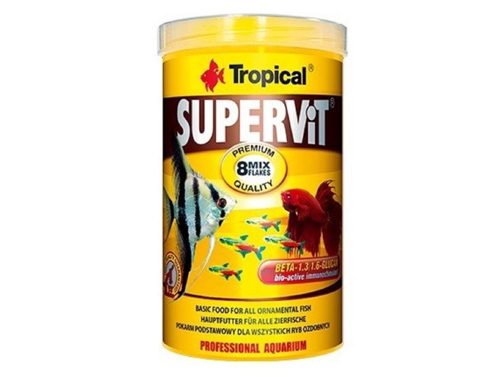 Obsahuje osm různých druhů vloček, obsahujících mimo jiné: imunostimulátor beta-glukan, astaxanthin, řasu kelp, spirulin, korýše včetně chutného krila. Několik desítek nejkvalitnějších vybraných složek, které doplňuje optimálně sestavené spektrum vitamínů a mikročástic, zajišťuje potřebné živiny a energií i pro ty nejvíce vybíravé druhy ryb. Neobvyklé bohaté složení krmiva Supervit způsobuje, že se používá především v populárních mnohodruhových akváriích, kde je základem potravy, která se pouze v případě potřeby doplňuje rostlinnými krmivy a krmivy s vysokým obsahem bílkovin.Složení: ryby a výrobky z ryb, obíloviny, bílkovinné extrakty rostlinného původu, měkkýši a korýši (moučka z krilu min. 1%, kalmaří moučka min. 1%), vedlejší produkty rostlinného původu (v tom výtažek z červené papriky 1200 mg/kg), řasy, kvasnice, oleje a tuky, minerální látky.Analytické složky: hrubý protein 48,0%, hrubé oleje a tuky 8,0%, hrubá vláknina 3,5%, vlhkost 6,0%.Doplňkové parametry