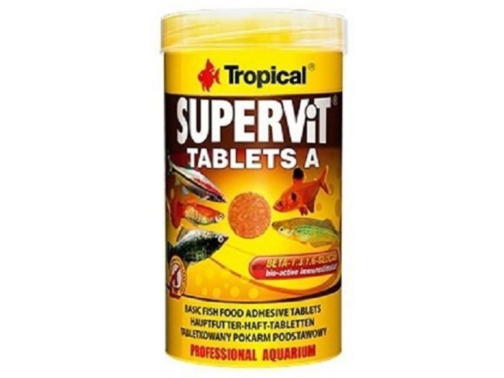 Obsažený v krmivu přirozený imunostimulátor – beta-glukan a stabilizovaný vitamín C posilují imunitní systém, pomáhají organismům zvířat bojovat s patogenními látkami. Několik desítek pečlivě vybraných složek špičkové kvality, doplněných optimálně zvoleným spektrem vitamínů a mikročástic, zajišťuje uspokojení potravinových a energetických potřeb i těch nejnáročnějších druhů ryb. Neobvykle bohaté složení krmiva SuperTabin A způsobuje, že má zvláštní použití v akváriích s různými druhy ryb.Složení: ryby a výrobky z ryb, obiloviny, bílkovinné extrakty rostlinného původu, měkkýši a korýši, maso a živočišné produkty, kvasnice (mezi jinými Beta-1,3/1,6-Glukan 1 000 mg/kg), vedlejší produkty rostlinného původu, mléko a mléčné výrobky, řasy, oleje a tuky, minerální látky.Analytické složky: hrubý protein 44,0%, hrubé oleje a tuky 6,5%, hrubá vláknina 2,8%, vlhkost 8,0%.Doplňkové parametry