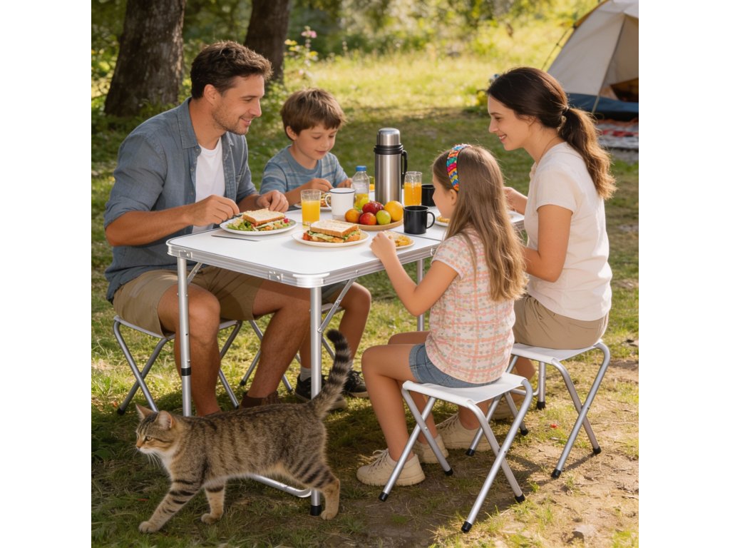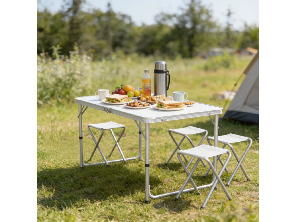 Ideální řešení pro milovníky odpočinku na čerstvém vzduchu! Tento kompletní turistický set se skládá z funkčního stolu a čtyř skládacích stoliček – připravený k odnesení do přírody, na zahradu, kemp nebo rodinný piknik 🏞️.