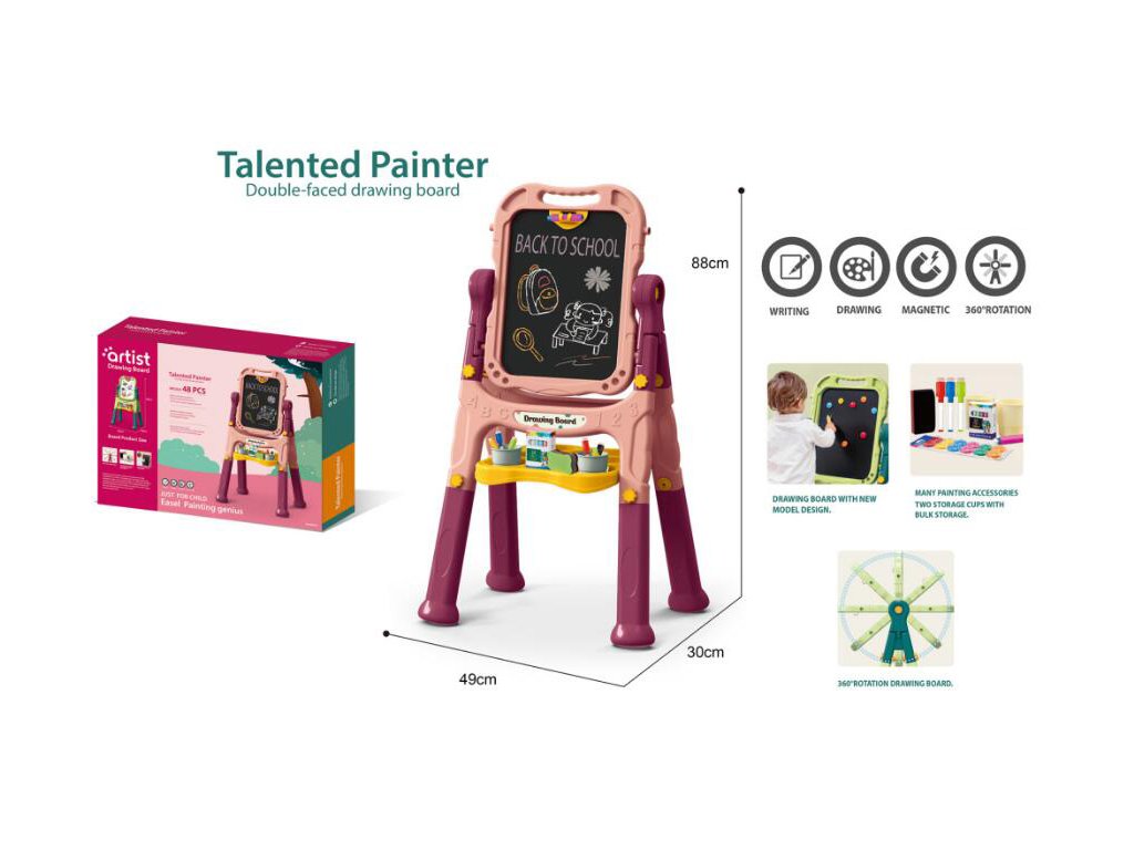 8829 Doporučený věk: 3+ Rozměry balení: cca 58 × 44 × 11,5 cm Celková výška: cca 88 cm Šířka: cca 48 cm | Hloubka: cca 34 cm Typ tabule: oboustranná (křídová + magnetická stíratelná)