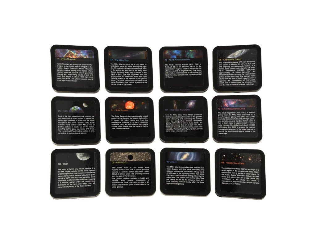 12 disků s obrázky vesmíru - které zobrazují objekty, jako je Země, Sluneční soustava, Mléčná dráha, Měsíc a mnoho dalších.