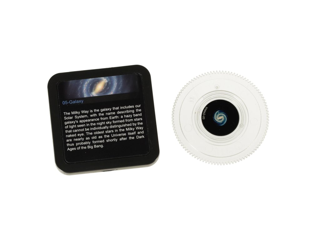 Sada obsahuje 12 disků s různými obrázky, včetně: Země, Sluneční soustava, Mléčná dráha, Měsíc. Každý disk je popsán a je na něm uveden krátký popis (v angličtině), který vám umožní dozvědět se něco o vesmírných objektech.