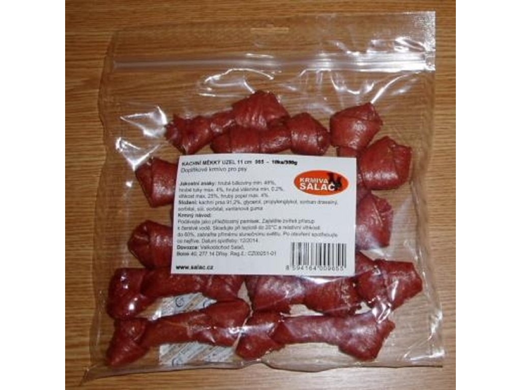 Masová pochoutka. Podávejte jako odměnu, nebo doplněk výživy.Složení: kachní maso 92%, kukuřičný škrob 3%, xantanová guma, konzervanty.Deklarované jakostní znaky: hrubý protein min. 35%, hrubé tuky 6%, hrubá vláknina min. 1,0%, vlhkost 25%, hrubý popel 4%Rozměr: 6-7cm Podávejte jako příležitostný pamlsek. Zajistěte zvířeti přístup k čerstvé pitné vodě.Doplňkové parametry