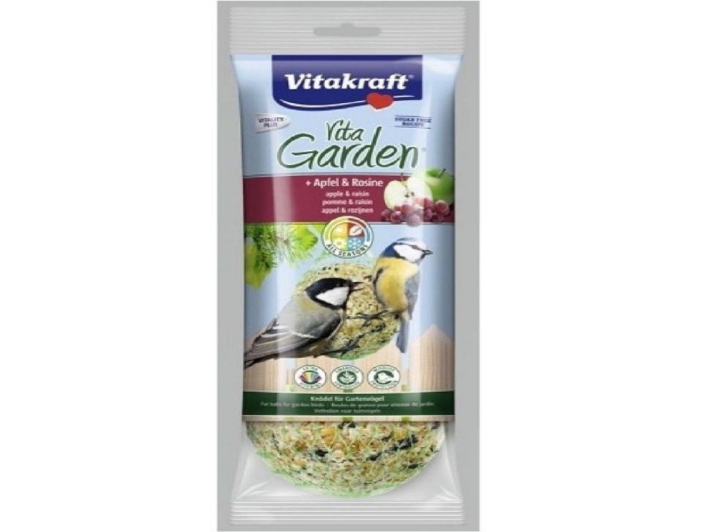 Lojové koule s kousky jablek a chutnými rozinkami jsou optimálním doplňkem přírodní stravy pro zahradní ptactvo. Jednotlivé složky jsou díky šetrné výrobě ještě výrazně rozpoznatelné a mohou být zvířaty beze zbytku dobře přijímány. Cenný tuk dodává ptákům energii a kromě toho zabraňuje kažení krmiva vlhkostí. Vita Garden knedlíky kromě toho poskytují zahradnímu ptactvu důležité vitamíny. Jednoduše pro větší rozmanitost hledání potravy!Složení: obilí, oleje a tuky, ovoce (jablka sušená 3 %, rozinky 3 %), minerální látkyZavěste co nejvýše do keře nebo na větve, aby se ptáci nestali snadnou kořistí - např. koček. Koule by měly být chráněné před deštěm, sněhem a přímým slunečním svitem.Doplňkové parametry