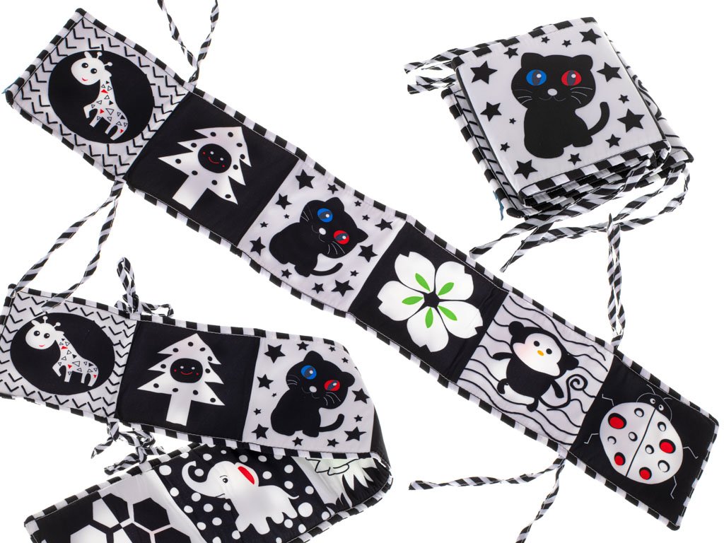 Knížka ve tvaru harmoniky je ideální jako ochranná podložka do postýlky. K příčkám ji lze připevnit pomocí provázku.