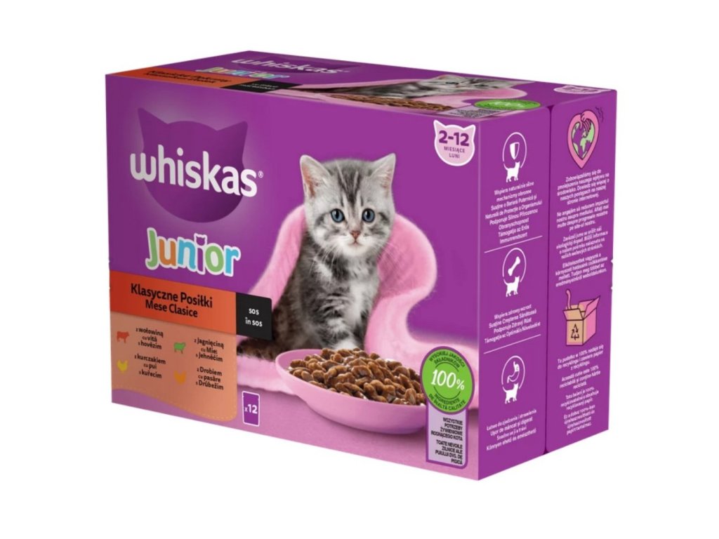 U koček v prvním roce života by se mělo dbát především na plnohodnotnou stravu, aby se mohly co nejlépe vyvíjet. Multipack Whiskas Junior kapsičkami 12 x 85 g děláte skvělou volbu: Krmivo je dokonale přizpůsobeno náročným nutričním potřebám mladých koček, a navíc skvěle chutná! Různé varianty krmiva obsahují všechny důležité živiny, které váš malý tygr potřebuje pro přiměřený růst, především hodně kvalitních živočišných bílkovin. Ty jsou optimálně doplněny chytrým výběrem mikroživin, mezi které patří například vitamín C, vitamín D3 a vápník pro normální kosti. Klasický výběr v omáčce: 3 x 85g hovězí3 x 85g kuřecí3 x 85g jehněčí3 x 85g drůbeží Složení: klasický výběr v omáčceHovězí: maso a vedlejší produkty živočišného původu (36 %, z toho 4 % hovězí v kouscích*), obiloviny, vedlejší rostlinné produkty, oleje a tuky, minerální látky, cukr.Kuřecí: maso a vedlejší produkty živočišného původu (36 %, z toho 4 % kuřecí v kouscích*), obiloviny, vedlejší rostlinné produkty, oleje a tuky.Jehněčí: maso a vedlejší produkty živočišného původu (36 %, z toho 4 % jehněčí v kouscích*), obiloviny, vedlejší rostlinné produkty, oleje a tuky.Drůbeží: maso a vedlejší produkty živočišného původu (36 %, z toho 4 % jehněčí v kouscích*), obiloviny, vedlejší rostlinné produkty, oleje a tuky.*Kousky tvoří 43 % výrobku. Analytické složení: 7,5% ptotein, 5% obsah tuku, 1,6% obsah anorganických látek, 0,20% hrubá vláknina, 84% vlhkost, 0,32% vápník. Doporučené dávkování: Věk (v měsících) Počet kapsiček/den ≤ 3 3 - 3 1/2 4 - 5 3 1/2 - 4 6 - 12 4 – 4 1/2Udělejte si čas na změnu krmení a přizpůsobte množství krmení podle potřeb vašeho zvířete. U koček s nadváhou snižte denní krmné množství. Dbejte na to, aby měla Vaše kočka neustále k dispozici dostatek pitné vody. Krmivo podávejte při pokojové teplotě, zbytky uchovávejte na chladném místě maximálně 2 dny.Doplňkové parametry