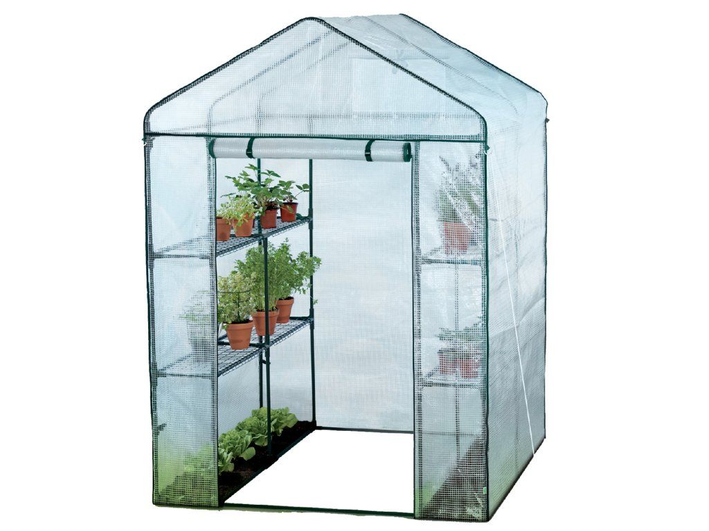 Poličky uspořádané vertikálně poskytují obrovské úspory místa a umožňují přehledné umístění velkého množství sazenic a květináčů.