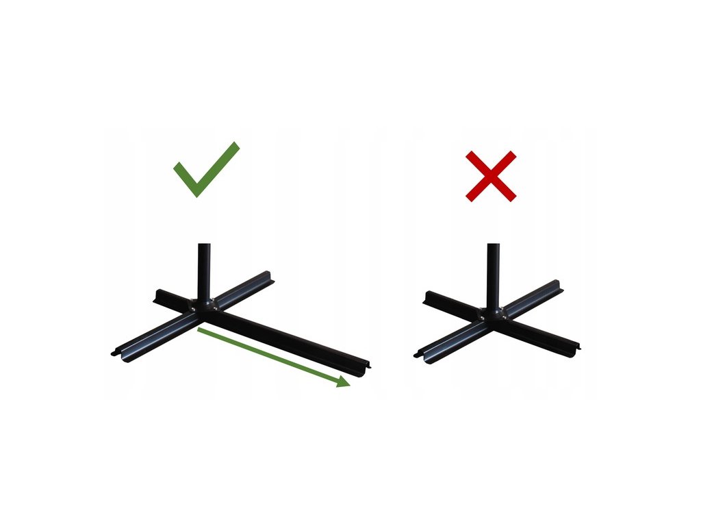 Na rozdíl od konkurence náš slunečník má velký a pevný stojan vyrobený z práškové lakované oceli. Stabilitu zajišťují speciální otvory umístěné na konstrukci nebo speciální zatížení (k zakoupení samostatně), určené k upevnění slunečníku k podkladu. Navíc byla přední noha prodloužena. Vidět to můžete na obrázku výše.